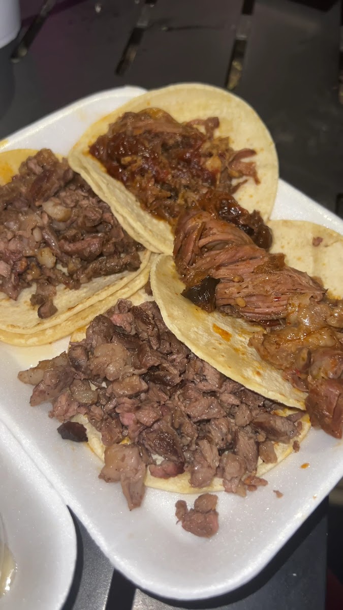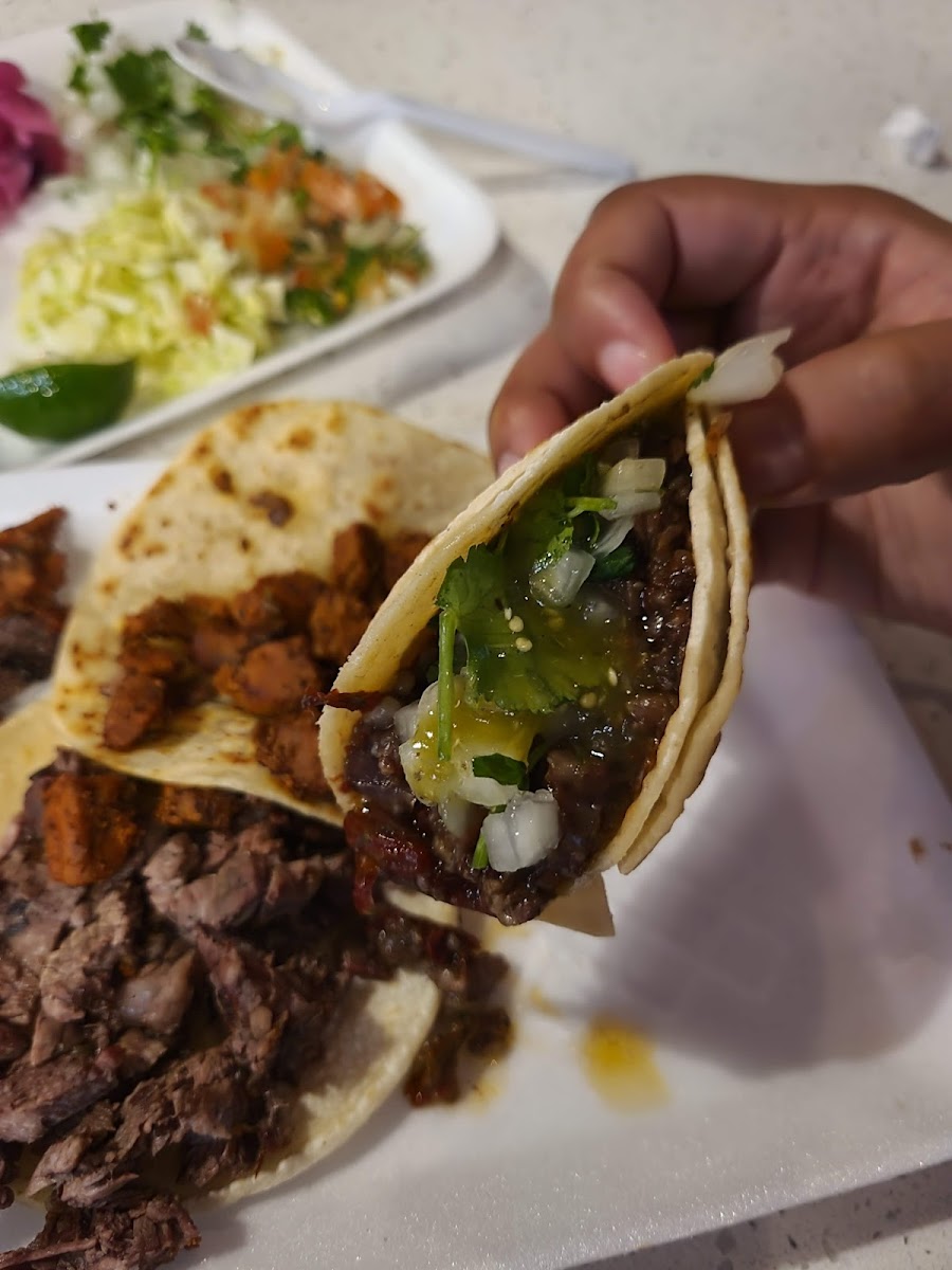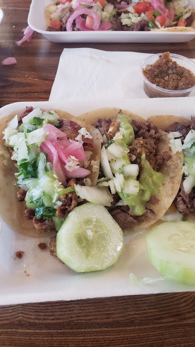 Some of the best tacos in town! Tacos meats were tasty and tender, we had the asada, pastor, & chicken. Tortillas were soft and did not stick together. The salsa bar was visually appealing, neat, & tidy with plenty of very fresh ingredients. Service was pleasant & efficient. A few paper napkins were scattered on the floor, I wish they could have swept those up but it was during the lunch rush. Restrooms were clean. Be prepared for loud music! Nice vibe. Overall a 5 star meal!